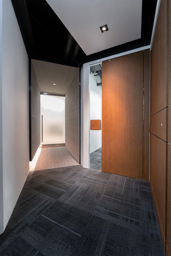 Access to the office is through a suspended stone tunnel that creates drama and excitement, culminating with a semi-transparent door that increases suspense.